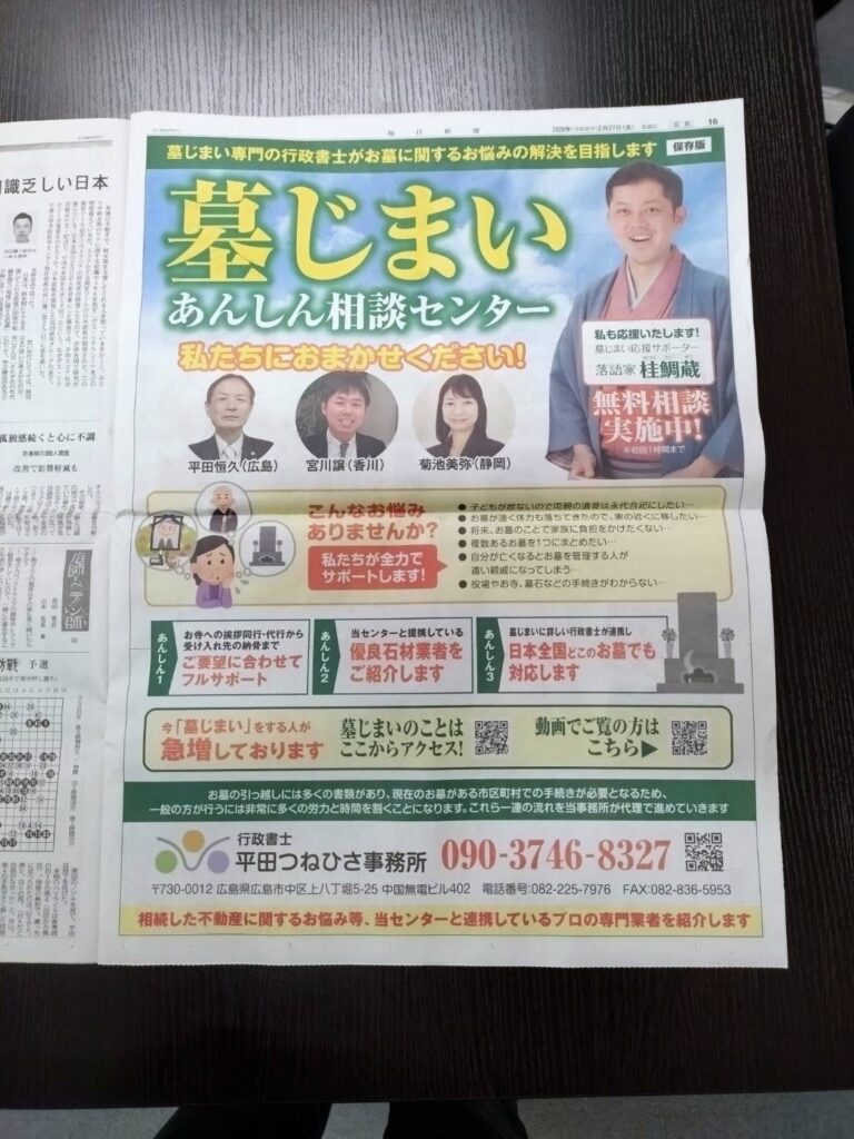 毎日新聞広島版、島根版、鳥取版の18面に墓じまいあんしん相談センターの全面広告を出しました(2026/2/27)